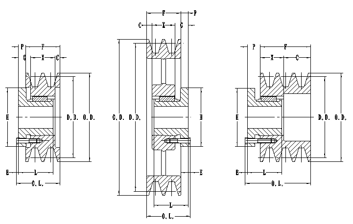 | Datum "A" Belts | Datum"B" Belts | Pitch"5V" Belts | Outside | Sheave | Bushing | O.L. | P | C | X | ||||